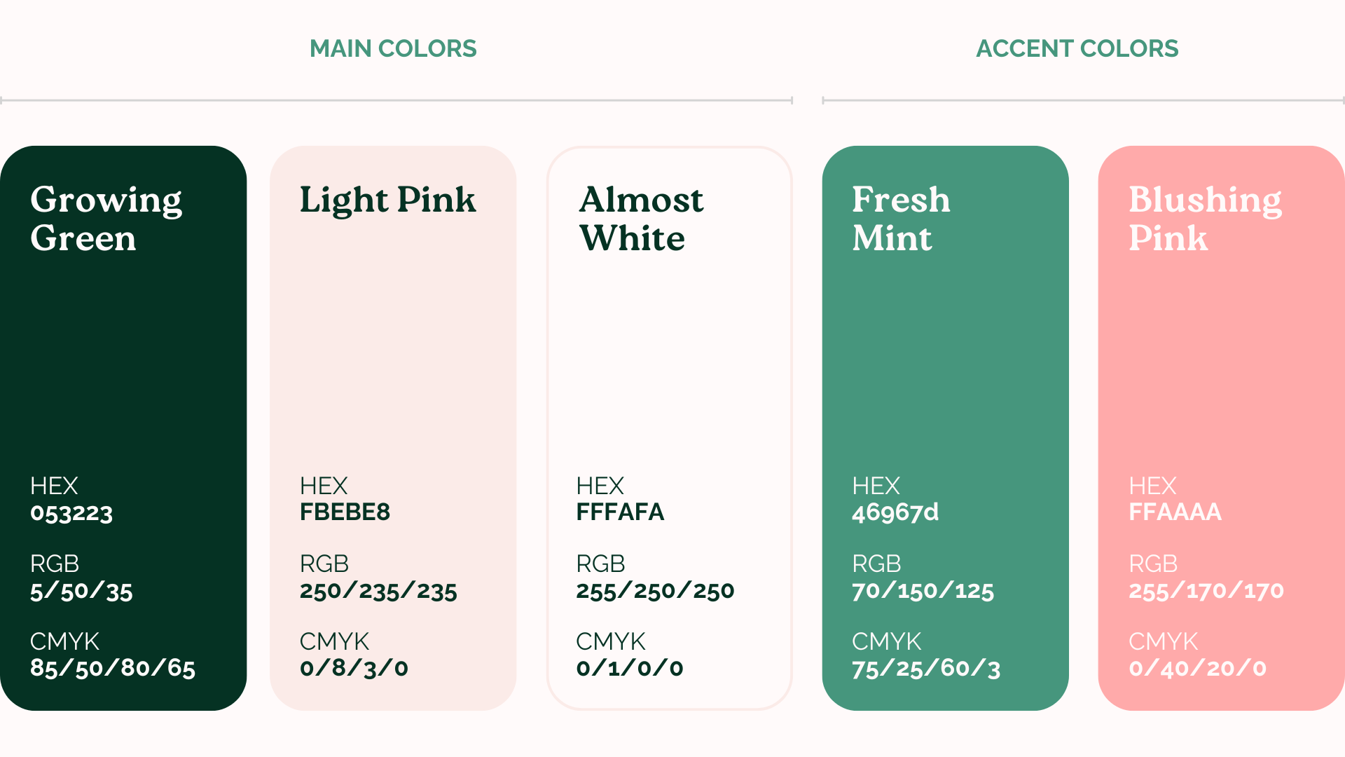 For the color palette, my client had a clear vision: they wanted something fresh and natural, with contrasting deep blues or greens and vibrant pinks, yellows, or oranges. Inspired by an extensive Pinterest board they curated, I developed five distinct color palettes, each with five colors. The client loved the options, making it a tough choice, but they ultimately selected a palette featuring greens and pinks. This included 'Growing Green,' 'Light Pink,' 'Almost White,' 'Fresh Mint,' and 'Blushing Pink'—three main colors and two accents. I think this selection beautifully reflects the brand’s values of growth and innovation.