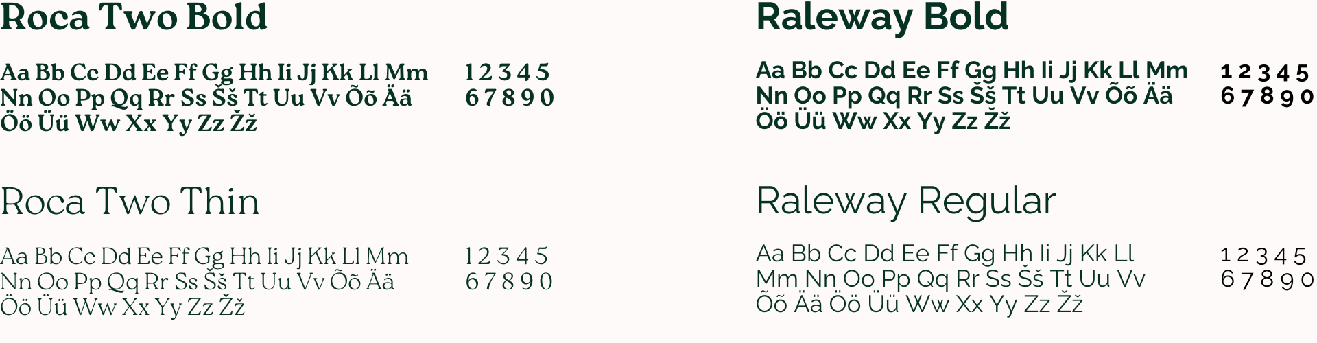 The typography selection was straightforward. I sought an elegant, natural, and slightly playful style, which led me to choose 'Roca Two.' Its bold weight serves as the main font, with thin as an alternative. For longer texts, I selected 'Raleway' for its elegance and readability. I feel that together, these fonts create a visually appealing combination.