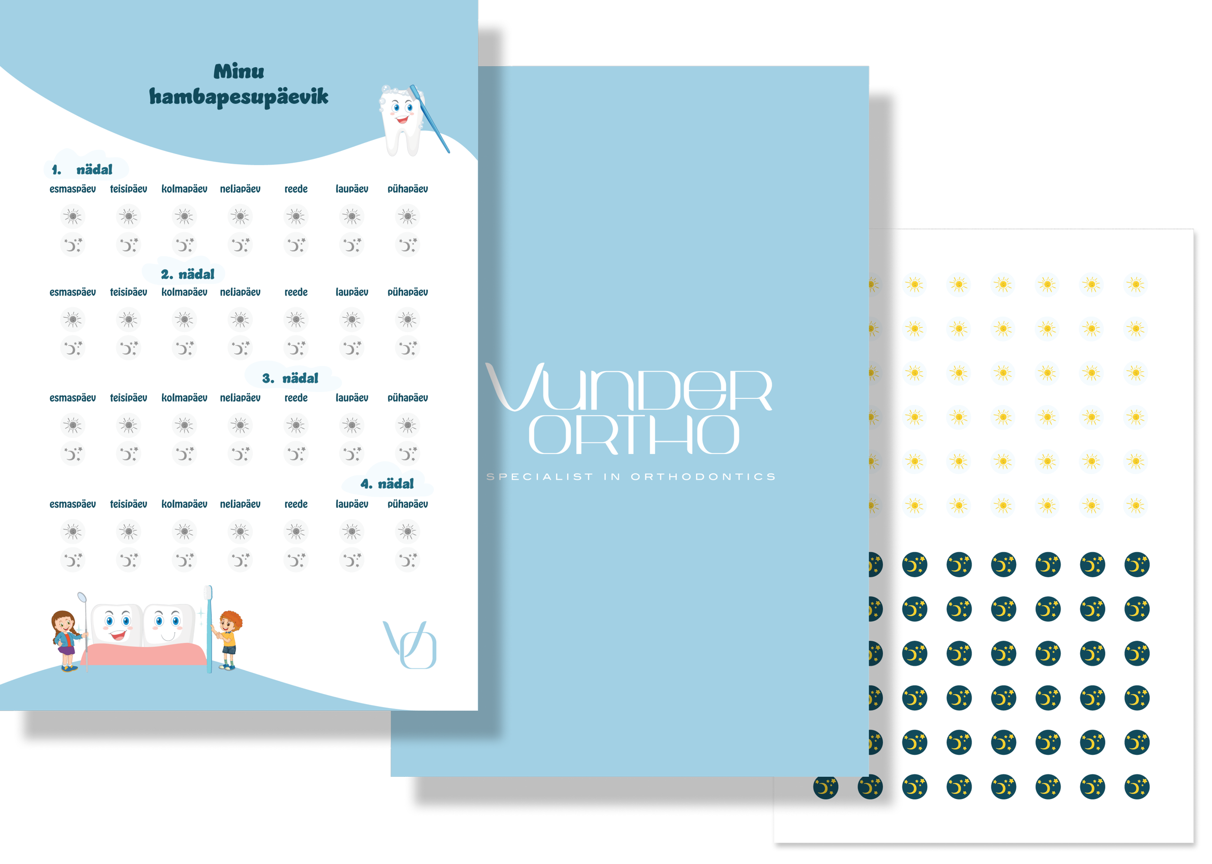 Children’s toothbrushing diary with stickers. Colors and logo taken from client’s brandbook and other elements designed to be kid-friendly.