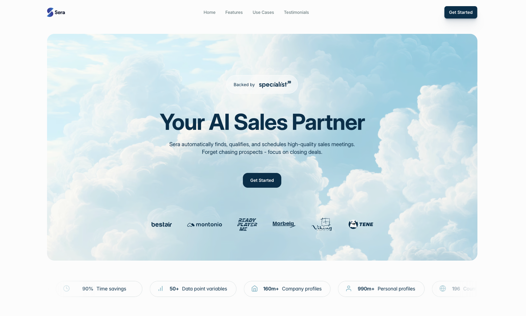 To give Sera a visual voice before its official brand launches, I built this light-as-air interface inspired by sky and clouds. Soft, looping cloud animations float across the hero header, adding a calm sense of motion. Subtle micro-interactions - section reveals, and feature cards that glide into view - keep users engaged without overwhelming them. The palette leans on sky blues and clean whites, deliberately neutral so the site can naturally evolve once a full CVI is established. Overall, I wanted the design to feel weightless, future-oriented, and refreshingly adaptable—an ideal staging ground for Sera’s next branding chapter.